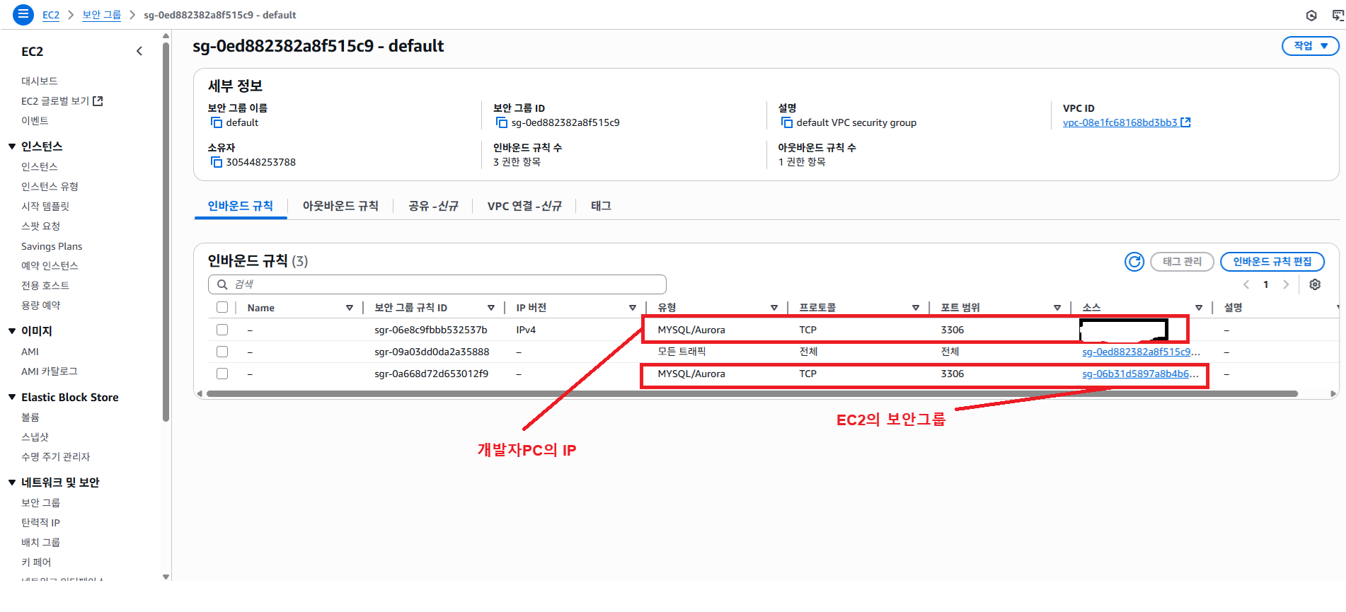 이 때 EC2는 개별 IP로 하기보다 EC2가 속한 보안그룹 자체를 넣어주는 것이 편하다.